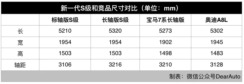 反正好不好看见仁见智,但S级自带的豪华霸气一定不会少,毕竟气质这块在尺寸上就已经被拿捏得死死的了——相比上一代车型,新车轴距增加了71mm,至3106mm;长轴版的轴距更长达3216mm,比上代增加了51mm(见上图,为海外数据),可以预想,乘坐舒适性自然会有一定程度的提升。